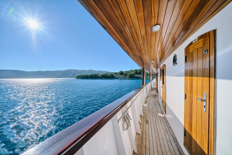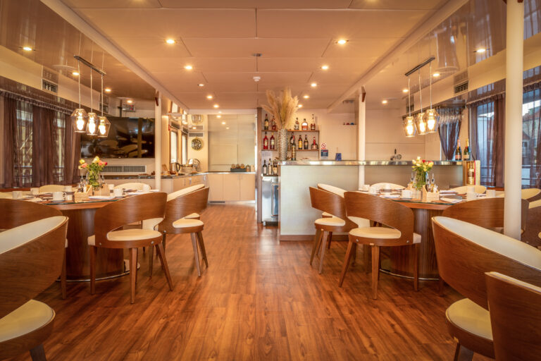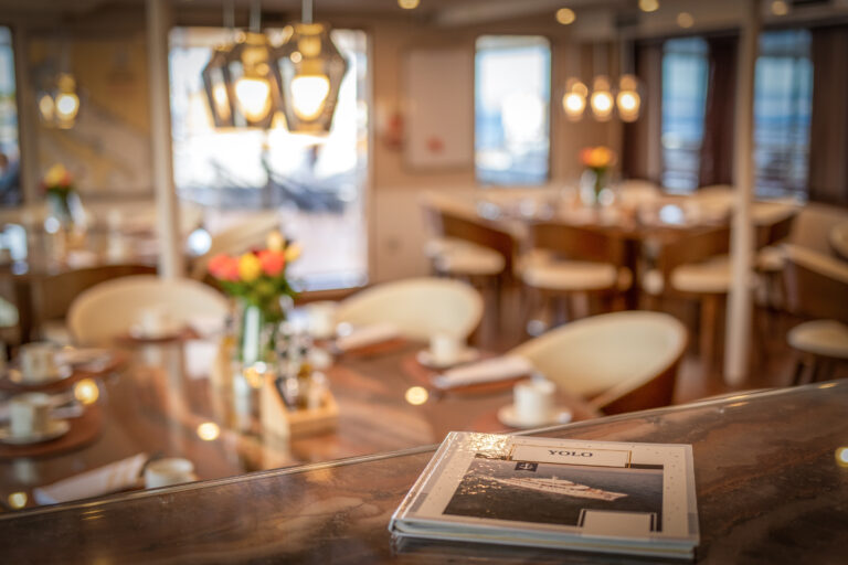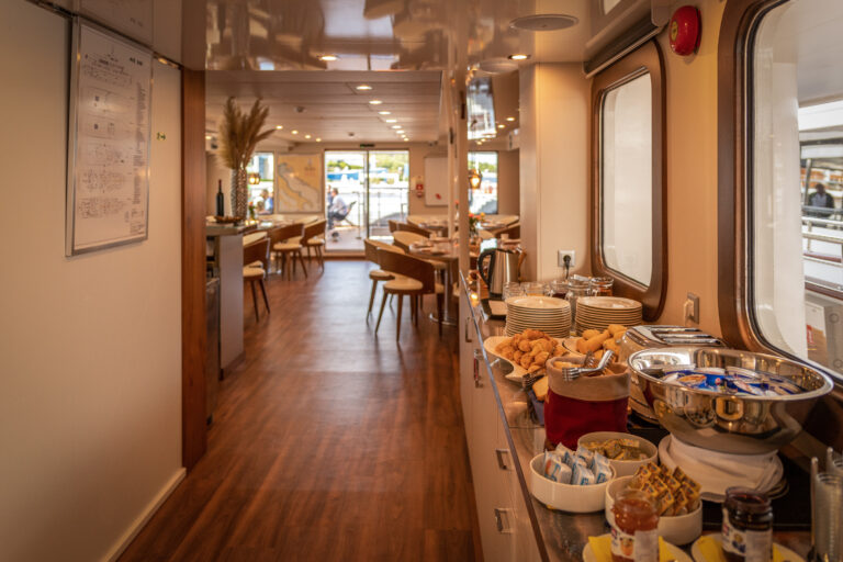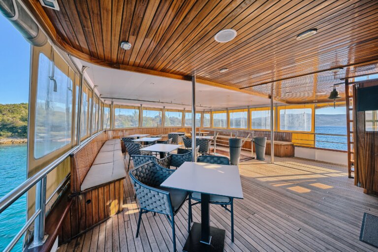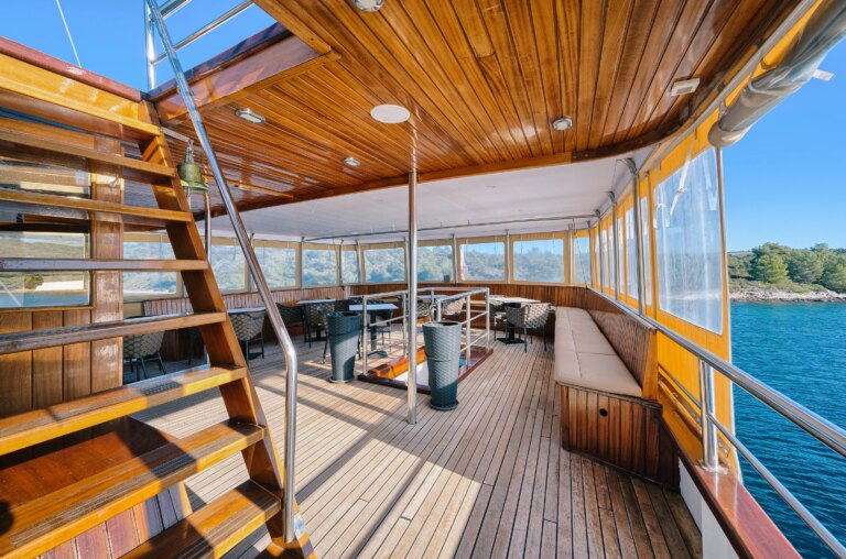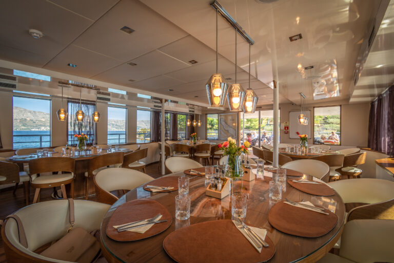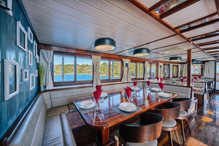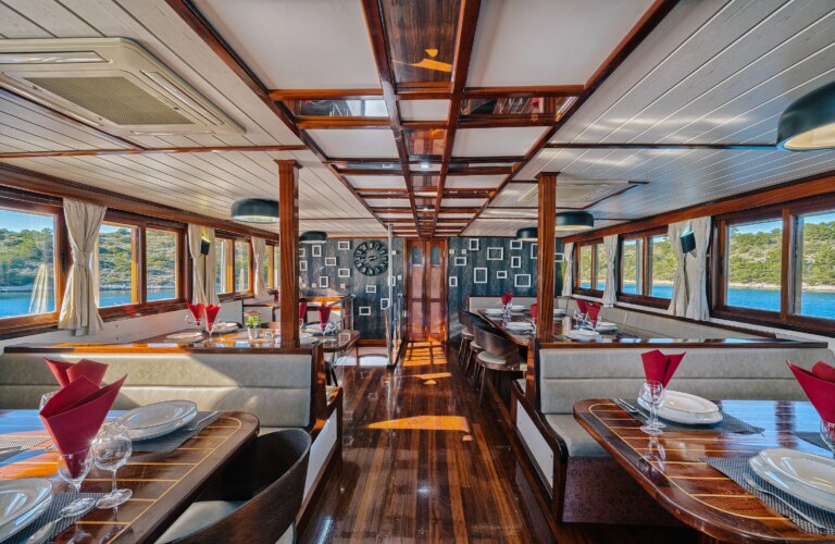 The barge Romantica accompanies and lulls its guests along the Croatian coast. In the common areas: a cozy and bright dining room with large panoramic windows and the bar where you can sit for an aperitif with a sea view.
